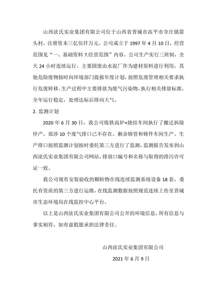 山西泫氏實(shí)業(yè)集團有限公司 環(huán)保信息公示資料
